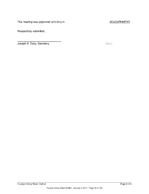 The meeting was adjourned at 6:30 p.m. ADJOURNMENT Respectfully submitted, Joseph B. Zoba, Secretary (Seal) Yucaipa Valley Water District Page 6 of 6 Yucaipa Valley Water District - January 3, 2017 - Page 10 of 120